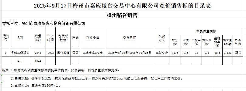 受客戶委托,梅州市嘉應(yīng)糧食交易中心有限公司定于2025年9月17日(星期三)舉辦糧食競(jìng)價(jià)交易會(huì)。梅州市嘉泰糧食和物資儲(chǔ)備有限公司擬銷售2022年產(chǎn)早秈稻谷2844噸。