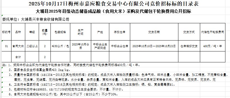 大埔縣2025年縣級(jí)動(dòng)態(tài)儲(chǔ)備成品糧(食用大米)采購(gòu)及代儲(chǔ)包干輪換費(fèi)用公開招標(biāo)公告