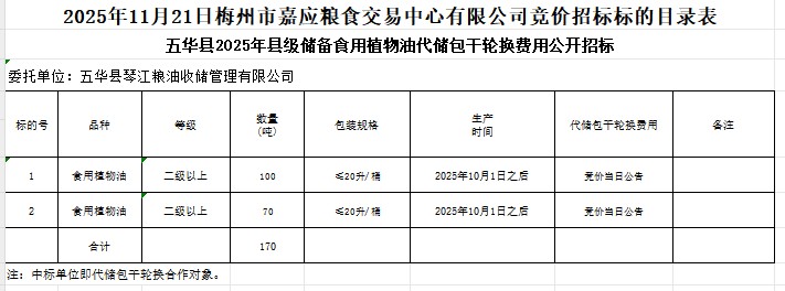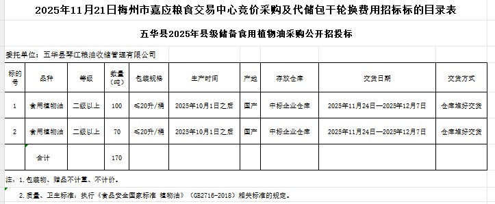 2025年11月21日五華縣2025年縣級(jí)儲(chǔ)備食用植物油采購(gòu)及代儲(chǔ)包干輪換費(fèi)用公開(kāi)招標(biāo)公告